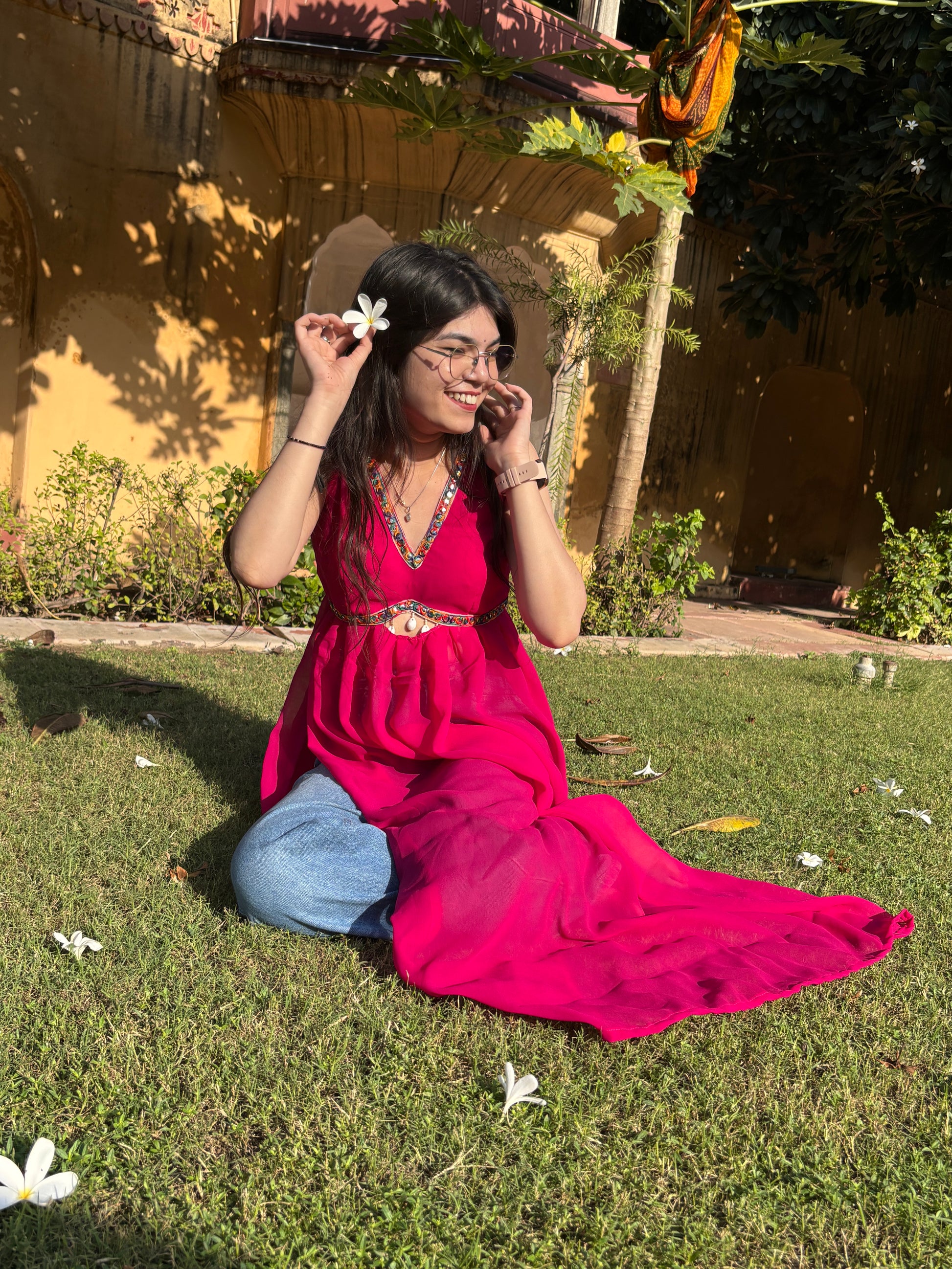 This elegant fuchsia pink dress is crafted from premium Zorjhat fabric, giving it a soft, airy, and graceful drape. Designed with a flattering V-neckline, it features a stylish waist cut-out and an open-back pattern, beautifully bordered with mirror and colorful thread embroidery that adds a touch of traditional Rajasthani artistry.