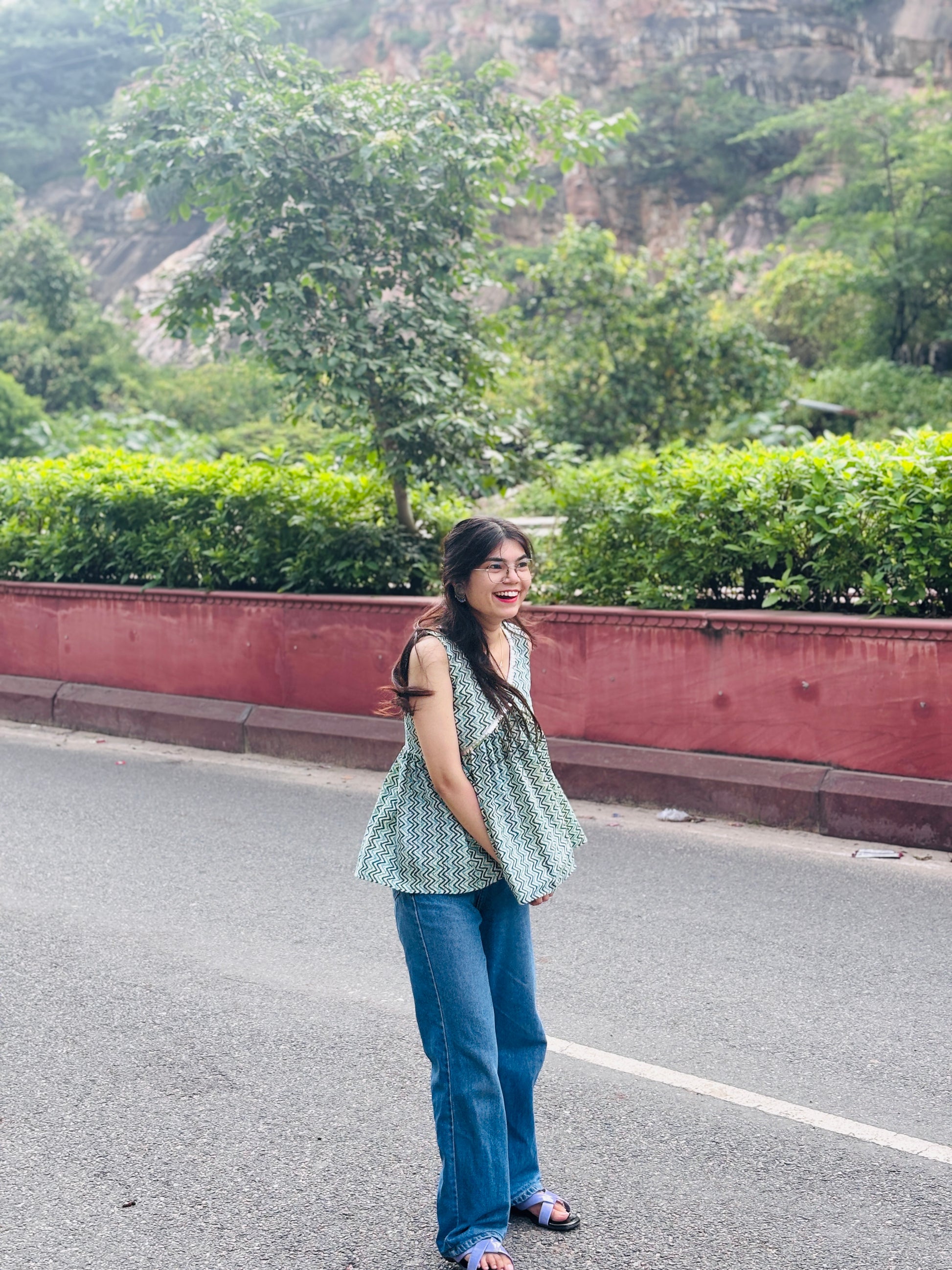 Made from lightweight, breathable cotton, this kurti features a zigzag leheriya-inspired pattern in soothing teal, green, and off-white tones. The print draws from Jaipur’s traditional textile art, giving it both a vibrant and heritage-rich appeal.